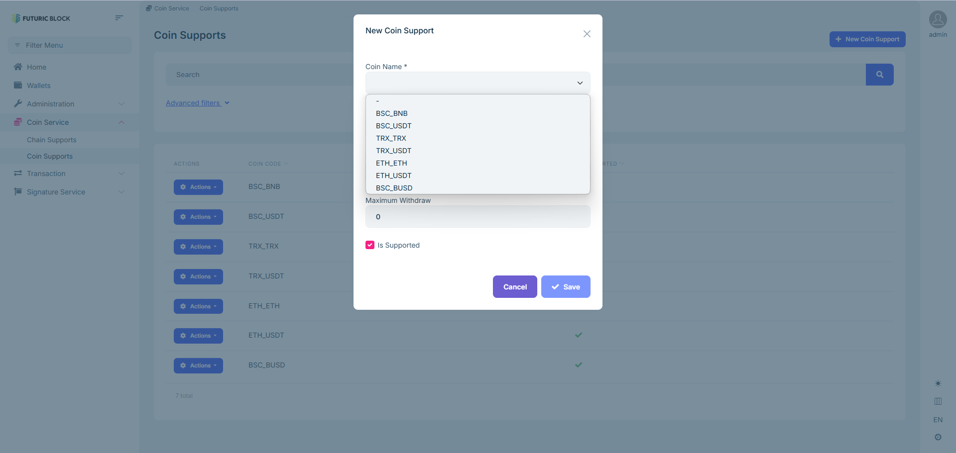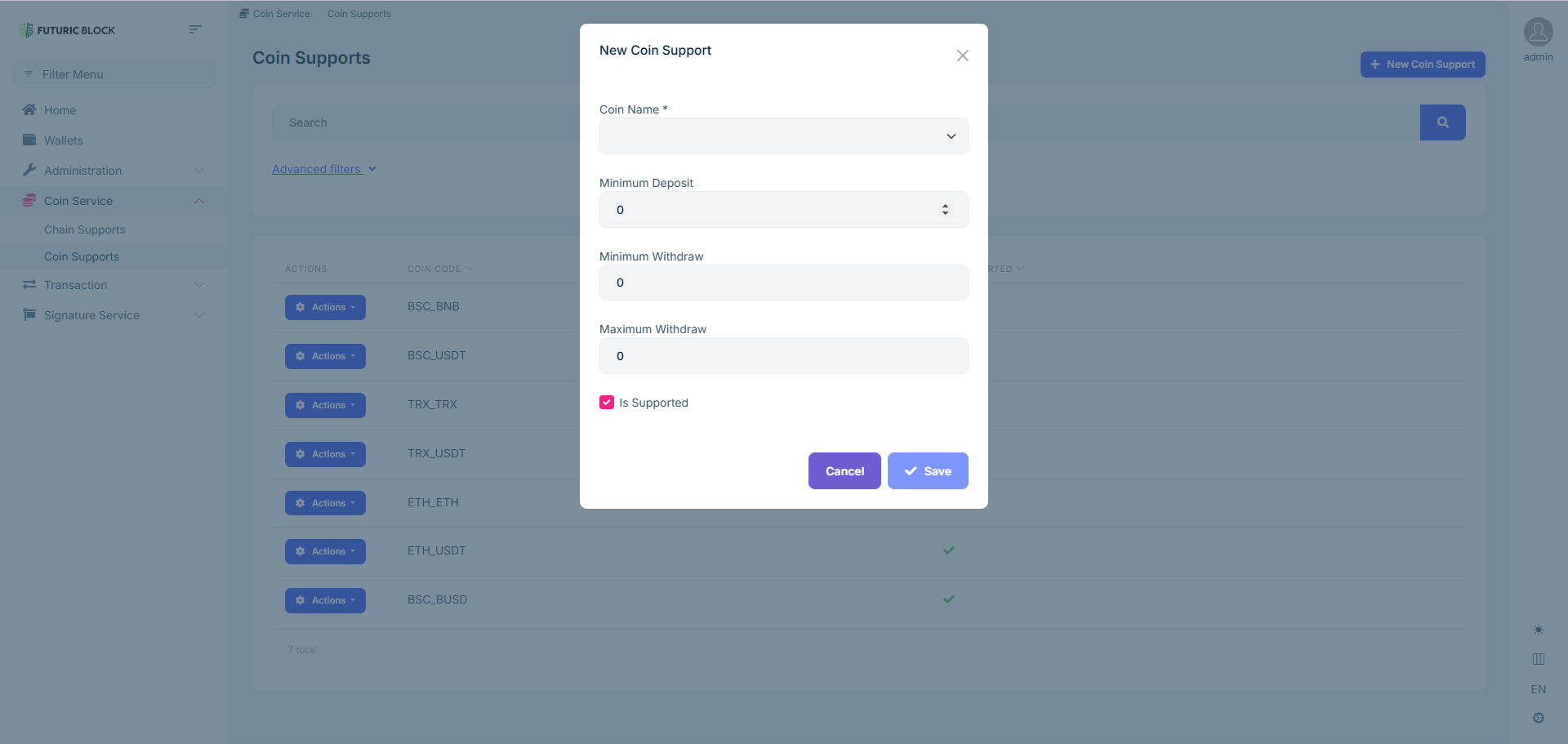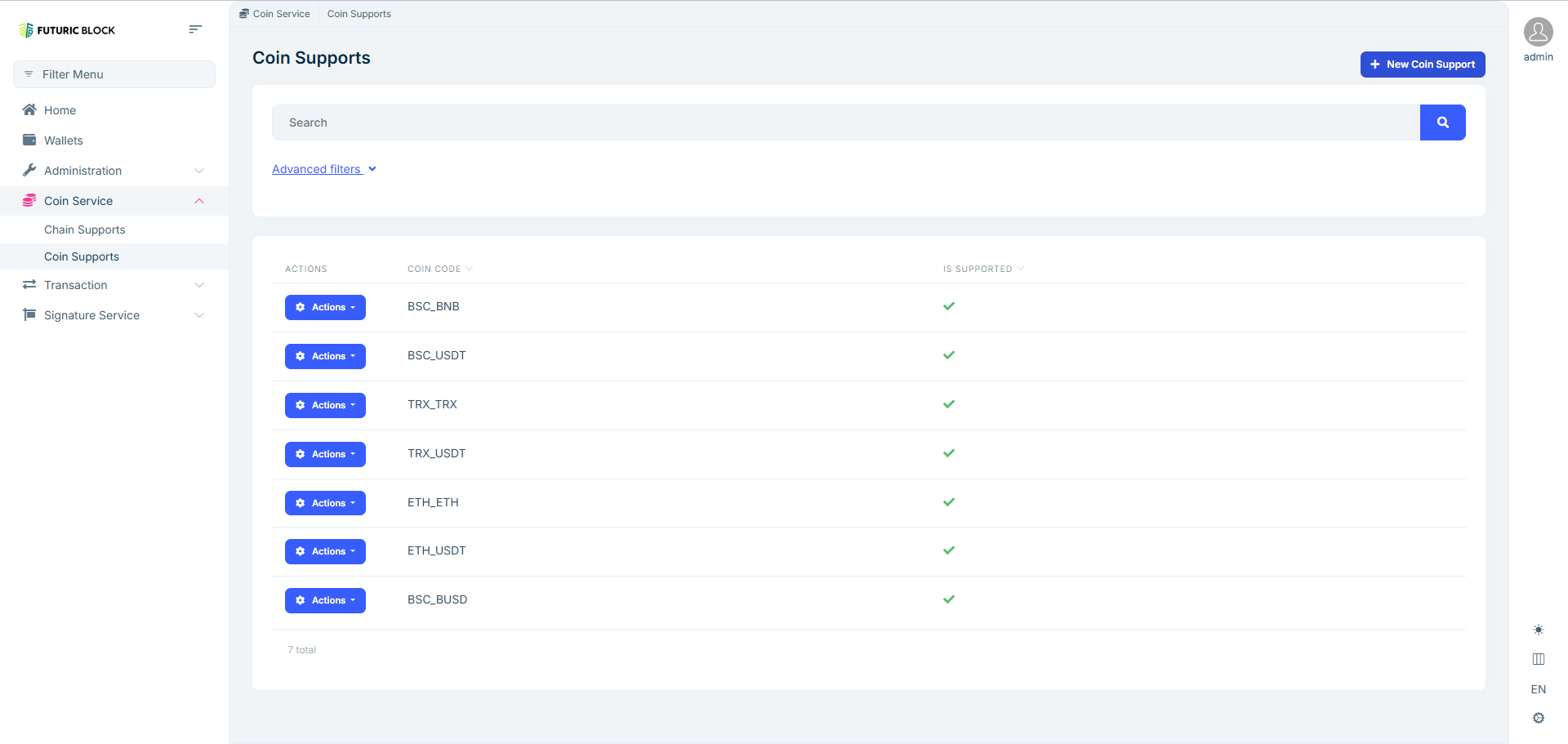 <figure><img src="https://1480652020-files.gitbook.io/~/files/v0/b/gitbook-x-prod.appspot.com/o/spaces%2FFFXZRmLJYkwqseBKbxa7%2Fuploads%2FMzzicw8CxlDAPDwmc14Y%2Fimage.png?alt=media&#x26;token=a0238ee7-c9ba-4dee-a01a-a89025671021" alt=""><figcaption><p>Go to Coin Service - Coin Supports</p></figcaption></figure>